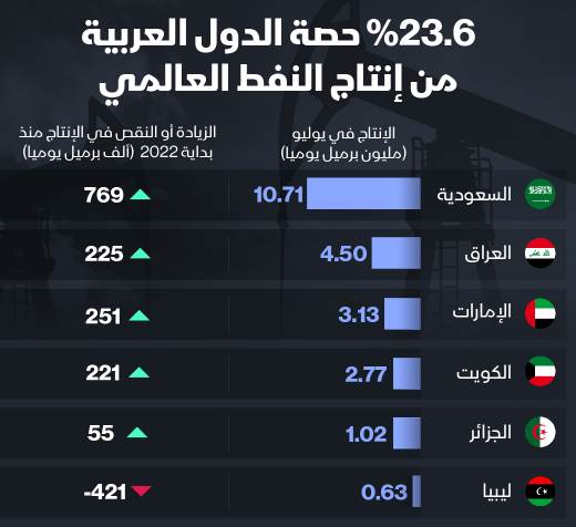 %23.6 حصة الدول العربية من إنتاج #النفط العالمي، #السعودية في المقدمة بـ 10.71 مليون برميل يومياً في يوليو، تلاها #العراق بـ 4.5 مليون