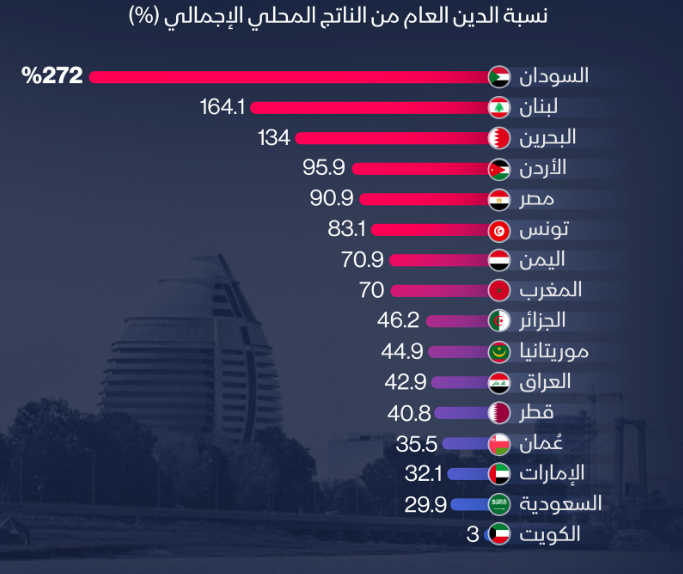 السودان ولبنان والبحرين والأردن ومصر، الأعلى عربياً في نسبة الدين العام إلى الناتج المحلي الإجمالي بنهاية 2024 حسب بيانات تقديرية لصندوق النفد الدولي .