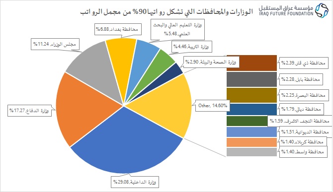 رواتب الحكومة العراقية : توزعت المصروفات التشغيلية ومن ضمنها الرواتب على 43 وزارة ومحافظة وهيئة. مثلت 15 وزارة وجهة حكومة 90% من مجمل الرواتب بينما مثلت ال 28 جهة المتبقية ما نسبته 10% من الرواتب فقط .