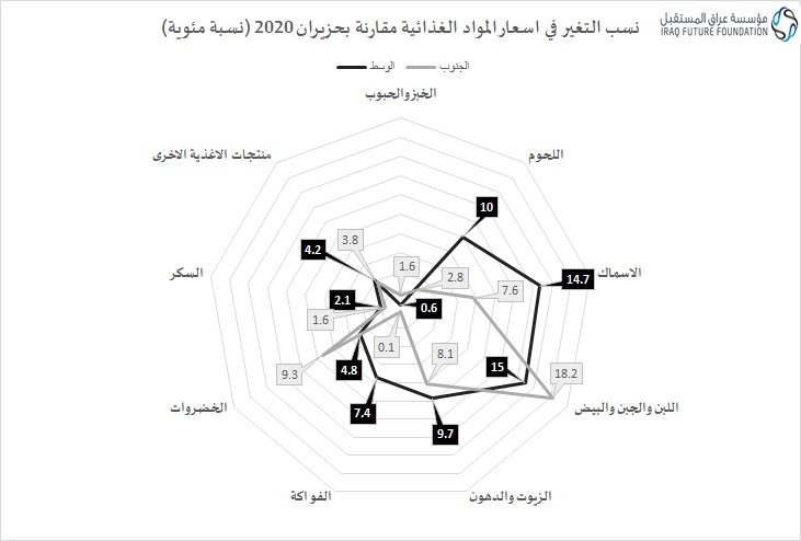 نسب التغير في اسعار المواد الغذائية مقارنة بنفس الفترة من العام الماضي كما مبينة في الشكل ؛