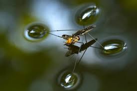تُظهر الصورة حشرة المشي على الماء، وهي مثال حي على تأثير التوتر السطحي. تستخدم الحشرة ساقيها الطويلة والمسطحة لتوزيع وزنها على سطح الماء، ما يمنعها من الغرق. قوة التوتر السطحي بين جزيئات الماء تعمل كغشاء مشدود تدعمه، بينما تساعد الزيوت أو الشحوم على أقدامها في تقليل البلل. هذه الظاهرة تُستخدم كنموذج في دراسة تكنولوجيا الطفو على السوائل وتصميم أجهزة دقيقة تحاكي الطبيعة