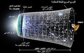 الصورة تمثل نموذج توسع الكون منذ الانفجار العظيم وحتى الوقت الحاضر، حيث يبدأ الكون من حالة كثيفة وساخنة جدًا تعرف بـ "الانفجار الكبير". يمر الكون بمراحل متعددة تشمل التوسع السريع للطاقة المظلمة، التشكل الأولي للمادة، تكوين النجوم والمجرات، ثم التوسع المستمر مع تطور الزمن على مدى 13.8 مليار سنة. يوضح النموذج مراحل مثل تشكل الإشعاع الأولي، انتشار المجرات، والانكماش الكوني، مع الإشارة إلى مكونات هامة كالمادة المظلمة والطاقة المظلمة.