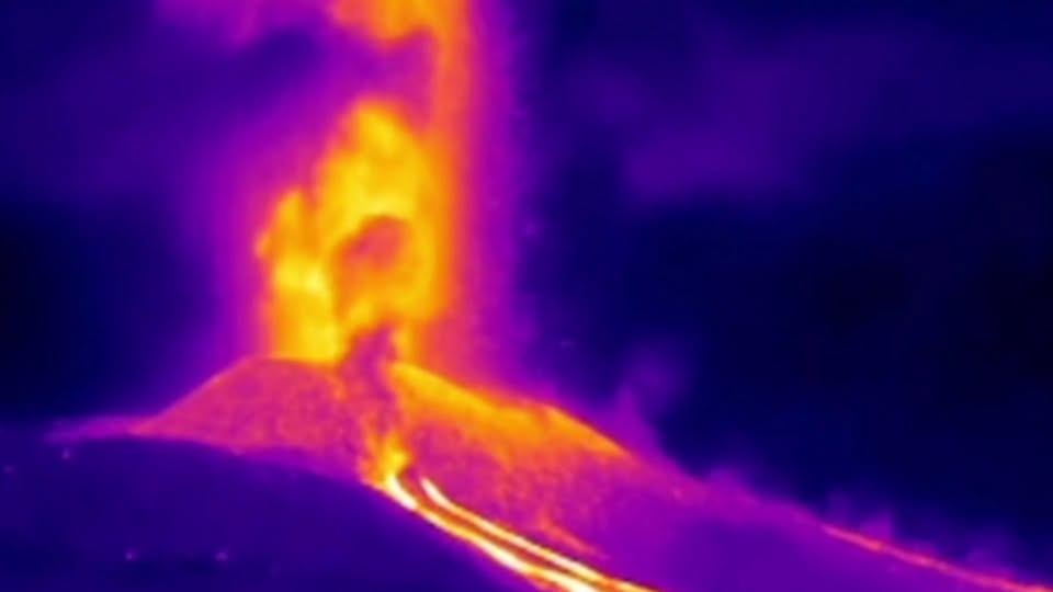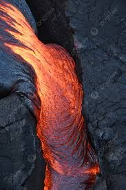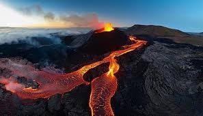 الصورة تظهر تدفق الحمم البركانية المصهورة وهي تتدفق فوق سطح الأرض. تدفق الحمم البركانية يمثل عملية فيزيائية حرارية معقدة، حيث تنتقل الصخور المنصهرة من باطن الأرض إلى السطح تحت تأثير الضغط والحرارة الهائلين داخل الصهارة البركانية. أثناء التدفق، تتحرك الحمم بسرعة متفاوتة حسب لزوجتها ودرجة حرارتها، ويمكن أن تصل سرعتها إلى عدة كيلومترات في الساعة في بعض الحمم الخفيفة القابلة للجريان، بينما تكون الحمم الغنية بالسيليكا أكثر لزوجة وأبطأ. كما تتأثر مسارات الحمم بالشكل التضاريسي للأرض.