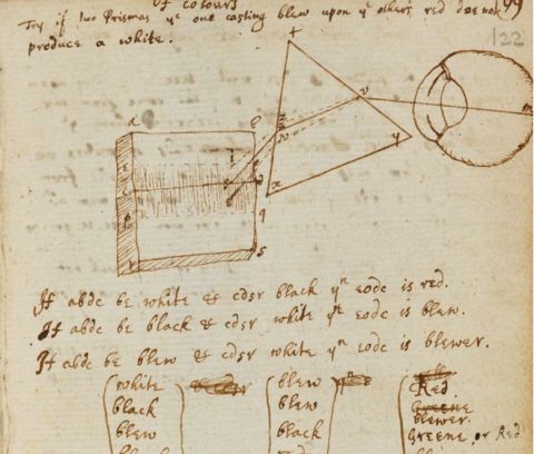 رسم يدوي للسير إسحاق نيوتن لتشتيت الضوء من خلال المنشور. الرسم مأخوذ من إحدى ملاحظاته عن البصريات.