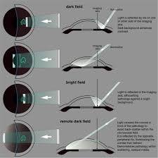 من الناحية الفيزيائية، تختلف طرق إضاءة العين أثناء الفحص الطبي في كيفية تعاملها مع الضوء. ففي تقنية الإضاءة المظلمة (Dark Field) لا يظهر إلا الضوء المتشتت من داخل أنسجة العين، مما يكشف تفاصيل دقيقة في القرنية أو القزحية لا نراها عادة. أما في الإضاءة الساطعة (Bright Field) فيُسمح للضوء المباشر بالمرور فيظهر النسيج أكثر وضوحًا لكن يخفي بعض التفاصيل الدقيقة. وهناك أيضًا الإضاءة المائلة (Remote Dark Field) التي تجمع الضوء المتشتت من زوايا مختلفة لتعطي صورة عالية التباين، تساعد الأطباء في تشخيص العين