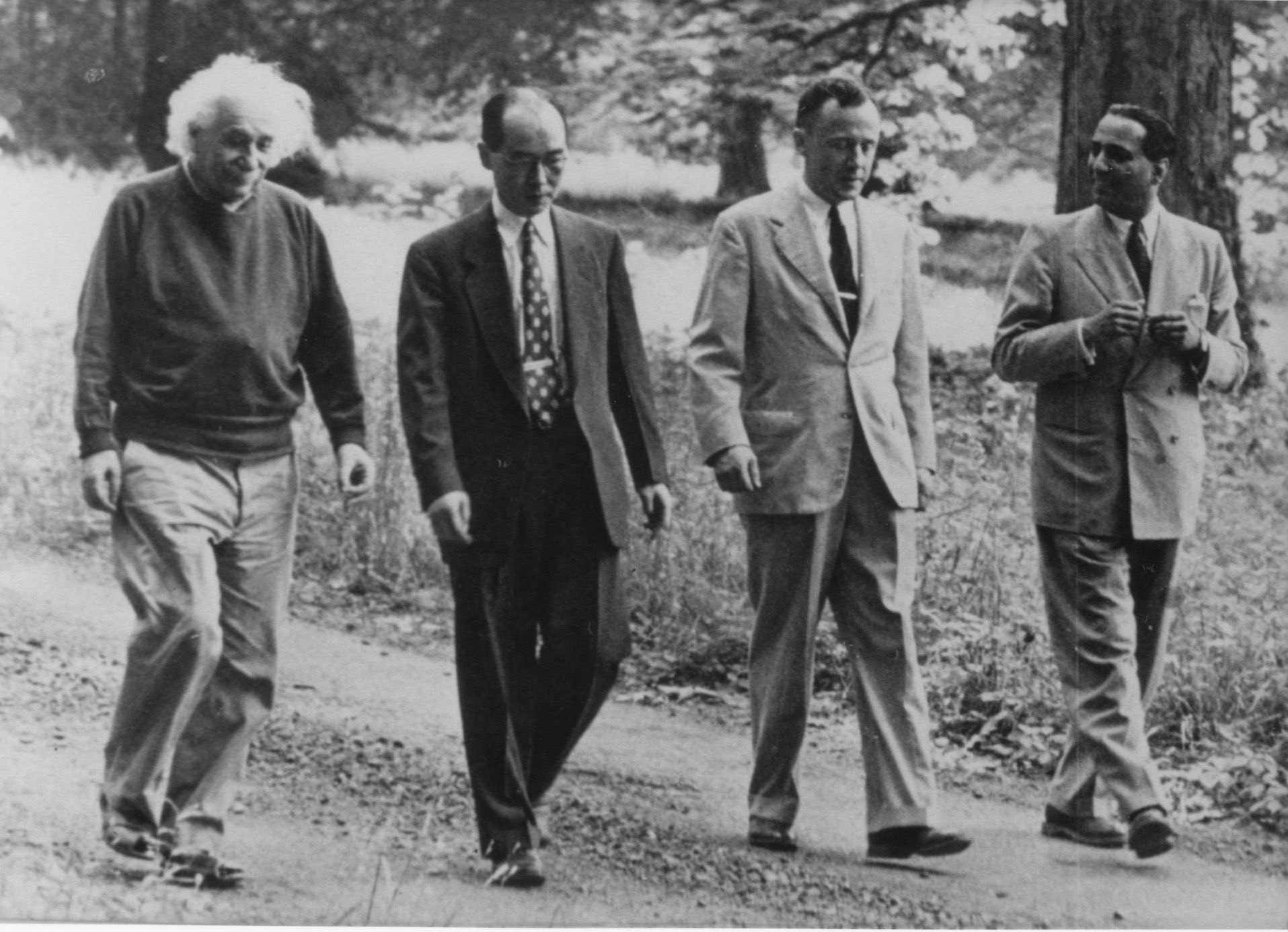 ألبرت أينشتاين وهيديكي يوكاوا وجون ويلر وهومي بهابها يسيرون في حديقة ماركاند في برينستون نيوجيرسي، 1954.