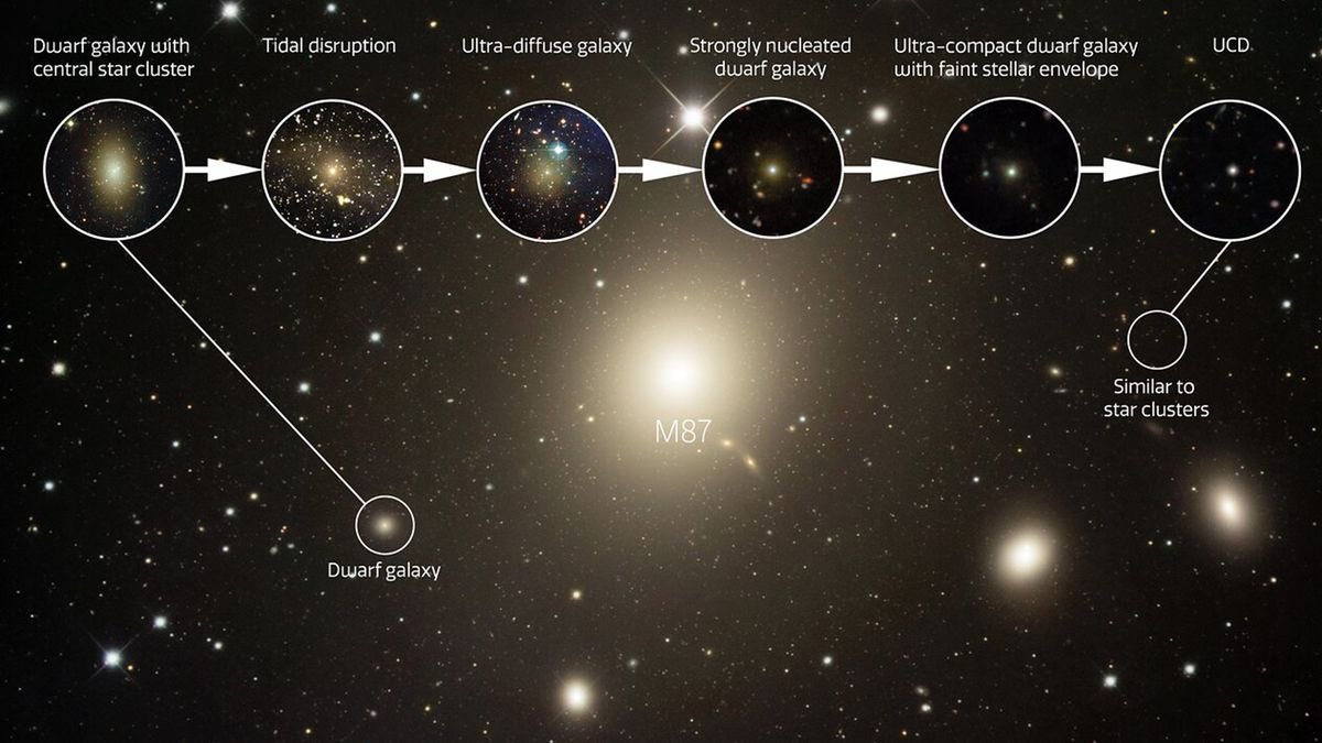 اكتشف علماء الفلك بقايا تآكل 100 مجرة قزمة تم تجريدها بعنف من طبقتها الخارجية من النجوم بواسطة مجرات أكبر. تمثل هذه المجرات المعطلة "الحلقة المفقودة" في تطور نوع محير من المجرات يسمى المجرات القزمة فائقة الصغر (UCDs).