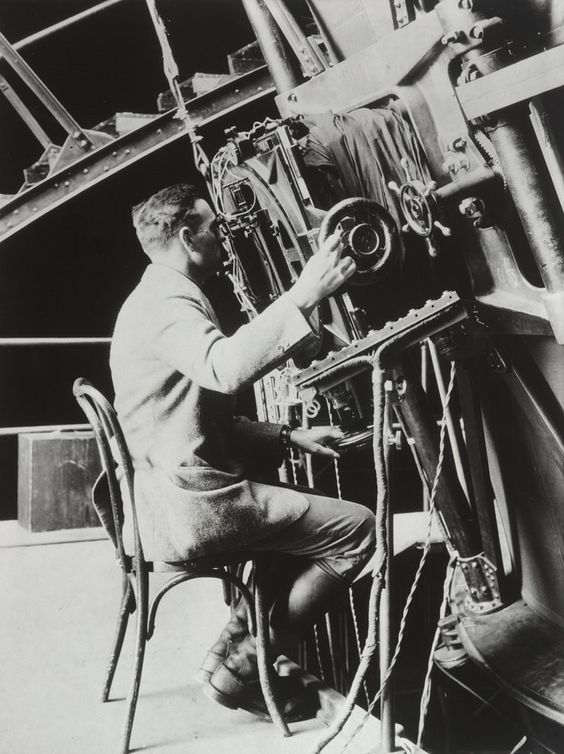 إدوين هابل يجلس بجوار التلسكوب العاكس مقاس 100 بوصة الموجود في مرصد جبل ويلسون.