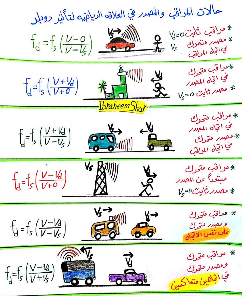 العلاقة الرياضية لتأثير دوبلر في حالات مختلفة.