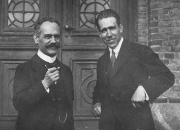 على اليمين نيلز بور، الذي إكتشف أن تكميم الزخم الزاوي هو أساس مدارات الإلكترونات حول نواة الذرة، أما الآخر فهو أرنولد سمرفيلد، الذي قام صياغة بنموذج بور بمدارات إهليليجية للإلكترونات