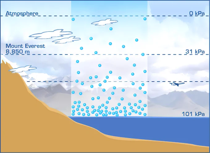الضغط الجوي تختلف قيمته بإختلاف الارتفاع عن سطح الأرض حيث تبلغ قيمته 101 كيلو باسكال عند سطح البحر وتقل كلما زاد الارتفاع لتناقص كثافة الهواء