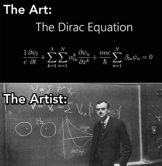 معادلة ديراك Dirac equation هي أحد المعادلات المركزية في الفيزياء النظرية حيث تصف حالة جسيم كمي (فرميون Fermion) له spin 1/2، وقد نتج عنها اكتشاف positron وهو جسيم بنفس كتلة الالكترون ولكن بشحنة موجبة +e