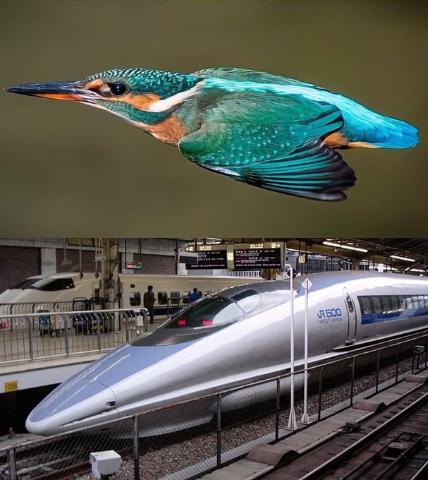 القطار الياباني (الرصاصة) قبل تطويره إلى شكله الحالي كان يعاني من مشكلة فعندما يبلغ سرعة 200 ميل في الساعة يتسبّب في خلق موجة صوتية انفجارية Sonic Boom صاخبة جدا في كلّ مرة يدخل فيها نفقا. طرح المهندسون عدة تصاميم لتحسين آيروديناميكية القطار، وكان أحسنها هو تصميم اقترحه أحد المهندسين بعد ملاحظته للطائر القاوند Kingfisher يغطس بشكل عمودي في الماء لاصطياد السمك دون أن يحدث أيّ اضطراب في سطح الماء برغم انتقاله من وسط لوسط آخر مختلف عنه في الكثافة.