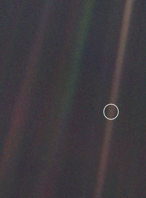 إنها الصورة الملتقطة من مركبة فوياجر 1 عندما تجاوزت حلقات زحل التفتت نحو كوكب الأرض ملتقطةً لها هذه الصورة التي تبدو وكأنها ذرة غبار مقارنةً بهذا الكون الفسيح!