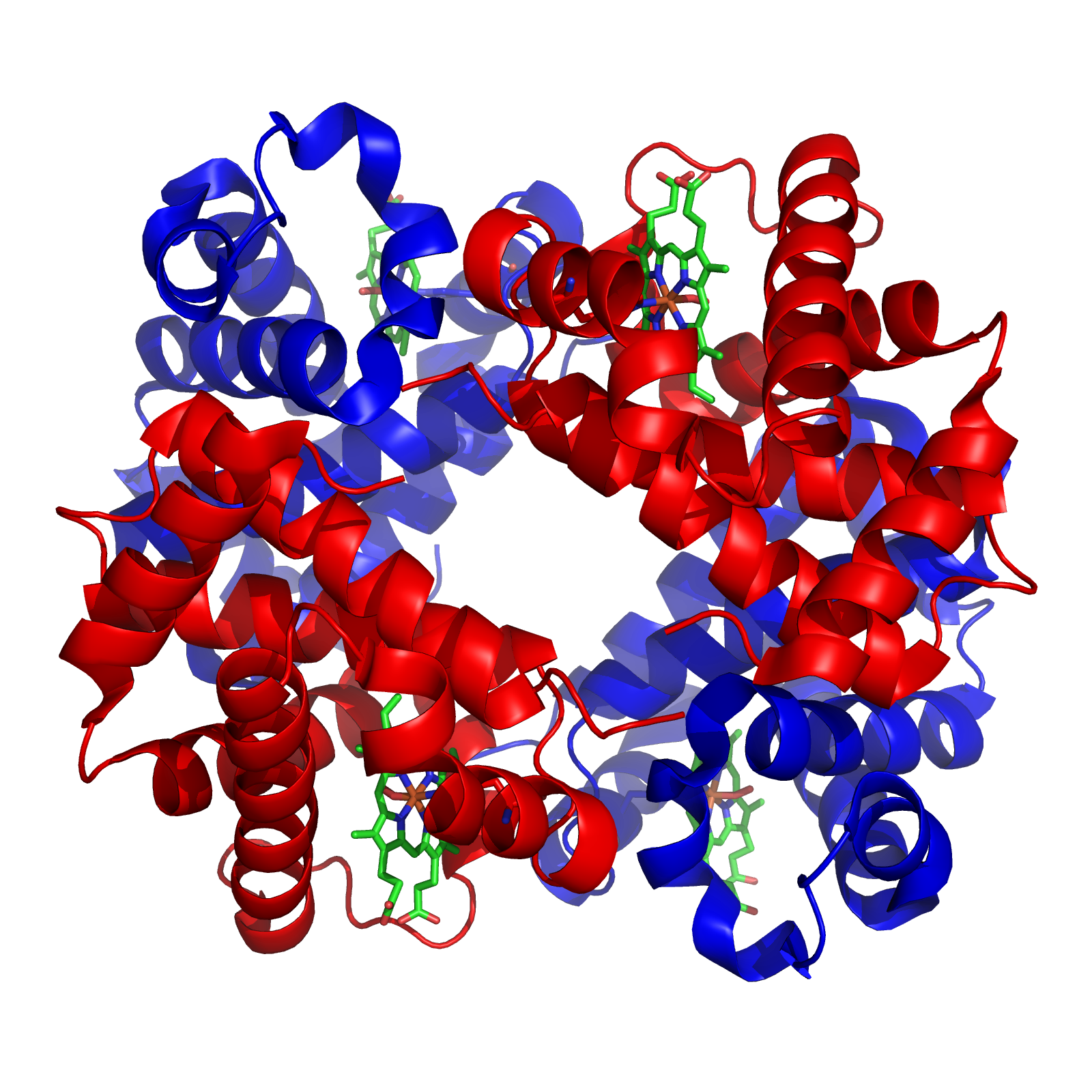 الهيموغلوبين: هو مركب تناسقي يحتوي على أيون الحديد Fe²⁺ في مركزه، ويرتبط بجزيئات الأكسجين في الدم وينقلها من الرئتين إلى باقي الجسم.