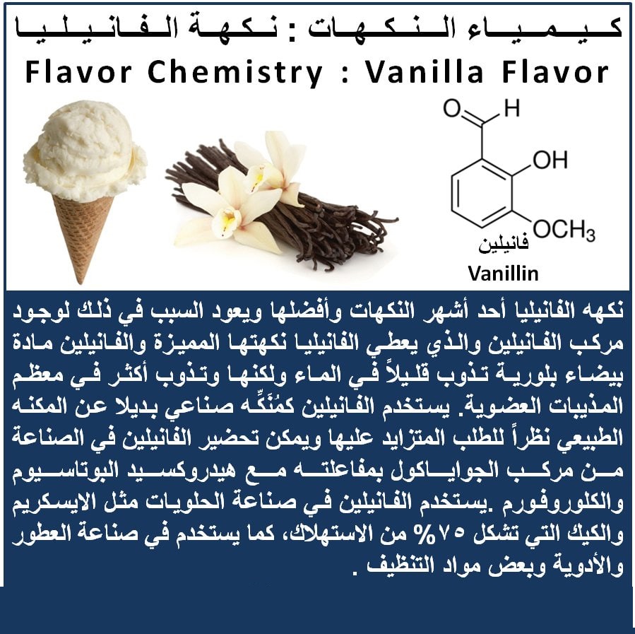 الفانيليا أحد أشهر النكهات المتوفرة المركب المسؤول عن هذه النكهه يسمى بالفانيلين Vanillin