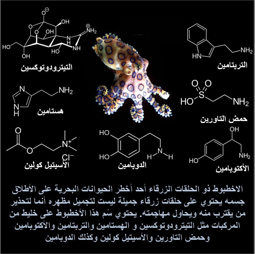 الأخطبوط ذو الحلقات الزرقاء يعتبر هذا الأخطبوط من أحد أخطر الكائنات سميه في العالم حتى الأن لايوجد علاج لسُم هذا الأخطبوط