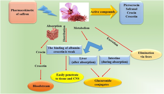 المركبات الكيميائية في الزعفران:تعتبر المركبات الموجودة في الزعفران مثل كروسين وكروستين وسافرانال وكايمبفيرول من مضادات الأكسدة ، مما يعني أنها تعمل على عكس الخلايا وحمايتها من التلف التأكسدي.والكروسين هو المسؤول عن لون الزعفران ويمتلك خصائص علاجية مختلفة ، بما في ذلك التأثيرات على اضطرابات الجهاز العصبي (عامل مضاد للذهان ، ومضاد للاكتئاب ، ومزيل للقلق ، ومثير للشهوة الجنسية) بالإضافة إلى خصائصه المضادة للأكسدة والوقاية من أمراض القلب والأورام.