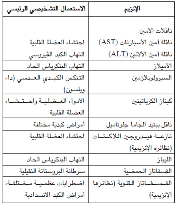 لقد مضى وقت طويل على استخدام الأطباء الممارسين القياس مستويات بعض الإنزيمات البلازمية غير الوظيفية. ويجري الآن الحصول على هذه المعلومات التشخيصية القيمة في معظم الحالات بواسطة أجهزة ألية تماماً. ويضم الجدول في الصورة قائمة بالإنزيمات البلازمية الأساسية المستخدمة في مجال علم الإنريمات التشخيصي. وستجد في الملحق في أخر الكنثاب مجال القيتم السوية للإنزيمات الرئيسة المستخدمة لأهداف تشخيصية.