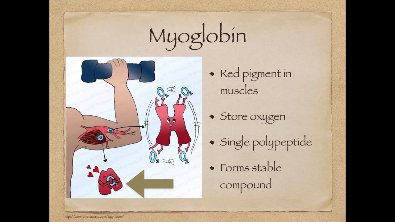 بروتين خزن الاوكسجين (الميوجلوبين): يقوم الميوجلوبين في الأنسجة العضلية الحمراء بتخزين الأكسجين ليحرره لاحقاً في حالات نقص الأكسجين (كما في حالة التمارين الشاقة) وتستخدمه متقدرات العضلات في عملية تصنيع ال(ATP) المعتمدة على الأكسجين.