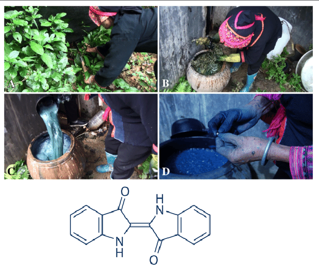 صبغة النيلة (Indigo)‏: يمكن الحصول عليها من نبات نيله الأسْيَوي، أو من نبات الوسمة، ويصبغ الصوف، والقطن (وهو الصباغ الأساسي للجينز). يعطي 100 كغ من نبات نيلة الأسيوي حوالي 1,5-2 كغ من الصباغ الخام، مع نسبة صافية حوالي 20%. وتكون النسبة أقل منها في الوسمة. وهي أقدم وأهم صبغة زرقاء كانت تستعمل في مصر والهند في الألف الثالث قبل الميلاد.