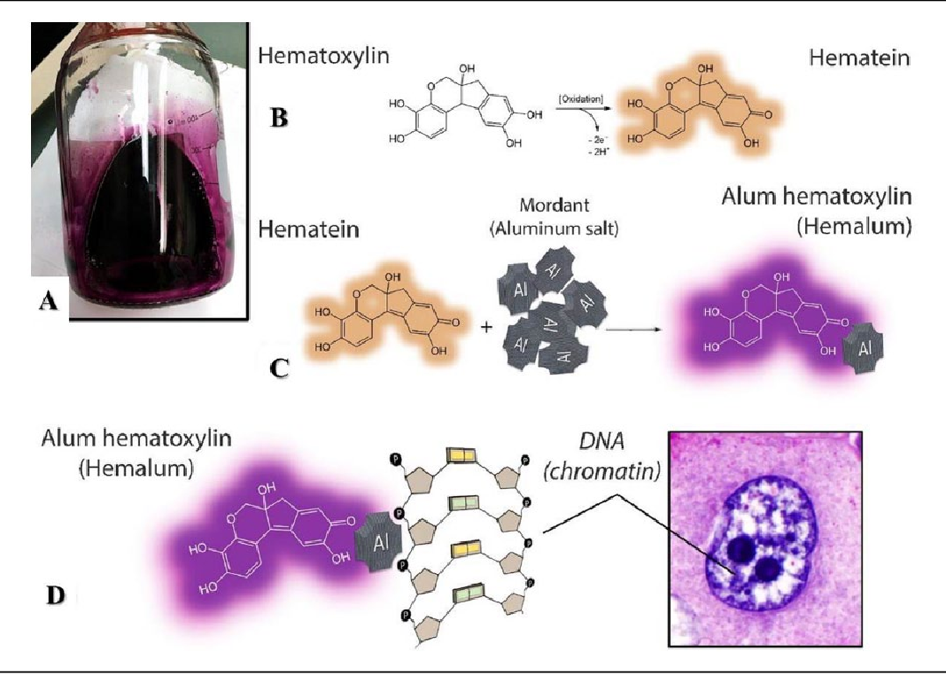 هيماتين (بالإنجليزية: Haematin)‏ : يستحصل من خشب لب شجر البقم ومن الأشجار ذات العمر 10-12 عام، حيث يوجد الشكل المُرجع (هيماتوكسيلين). يقطع الخشب ويترك ليجف لمدة سنة أو تتم الأكسدة إصطناعياً بالتخمير. كما أن الأكسدة السريعة ممكنة باستخدام النترنيت أو الكلورات أو الكرومات. الهيماتوكسيلين والأيوسين ‏ هي طريقة صبغ شائعة في علم الأنسجة . تلون هذه الصبغة أنوية الخلايا باللون الأزرق. استخدم هذا الصباغ بكثرة في الماضي في الصناعة النسيجية للحصول على لون أزرق وأسود ثابت على ألياف النايلون.