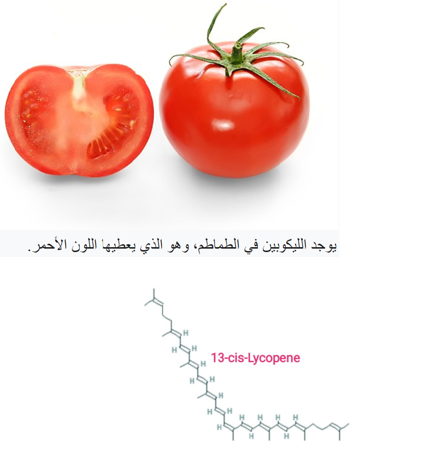 الليكوبين : هو كاروتين أحمر اللون موجود في الطماطم والبطيخ والفاكهة والخضاروات الحمراء اللون، مثل الجزر الأحمر، والفلفل الأحمر والبابايا. على الرغم أن الليكوبين هو نوع من الكاروتين كيميائيا ولكن ليس له نشاط الفيتامين أ). والليكوبين ليس مادة غذائية أساسية للبشر، ولكن يوجد عادة في النظام الغذائي، وبشكل رئيسي من الأطباق المحضرة من الطماطم (البندورة). عندما يمتص من المعدة، ويتم نقل الليكوبين في الدم عن طريق البروتينات الدهنية المختلفة وتتراكم في الكبد، والغدد الكظرية، والخصيتين.