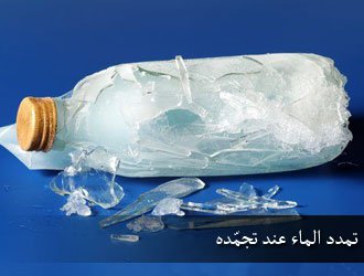 خلافا للعديد من المواد التي يتقلص حجمها بالتبريد ، فالمياه تتمدد كلما تجمدت. فمكعب الثلج يشغل حجم اكبر من 9٪ من الكمية المستخدمة من الماء في الاول ولهذا نلاحظ تحطم زجاجات الماء الممتلئة عندة تجميدها
