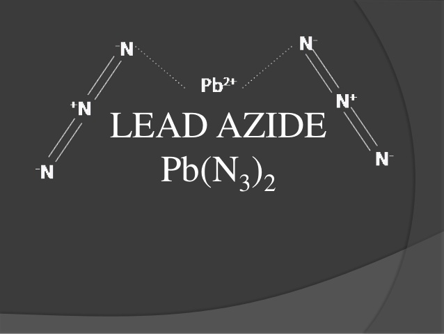 ازيد الرصاص Lead Azide في كبسولات وبواديء التفجير ‏حل ازيد الرصاص على نطاق واسع محل فلمينات الزئبق كبادئ تفجير في كبسولات التفجير . واستقرار الفلمينات اقل من المستوى المرغوب، كما يتوجب تصنيعها في دفعات صغيرة ، وتحتوي على زئبق نادر وسام . اما ازيد الرصاص فيتميز بدرجة عالية من الاستقرار، ولا يحتوي على مواد استراتيجية ، ويمكن تصنيعه في دفعات كبيرة عن طريق معالجة ازيد الصوديوم sodium azid بأسيتات او نترات الرصاص . ويمكن تصنيع ازبد الصوديوم من اميد الصوديوم sodium amide واكسيد النيتروز nitrous oxide