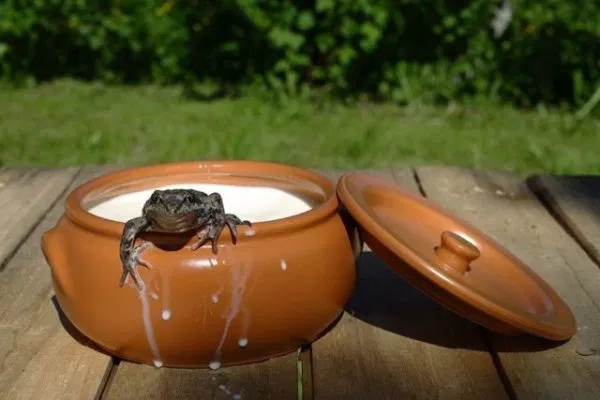 يتلف الحليب بعد أربعة أيام إن لم يتم حفظه، ولاحظ بعض سكان روسيا وفنلندا أن الحليب لا يفسد في حال وضع الضفدع البني داخله.واكتشف العلماء ان جلود بعض أنواع الضفادع تفرز مواد مضادة للبكتيريا والفطريات. وفي عام 2012 دراسة أثبتت أن جلد الضفدع البني يفرز 76 مادة تحارب البكتيريا في المختبر،وقال الباحثون: إن بعض المواد الكيميائية المكتشفة تحارب بكتيريا السالمونيلا والمكورات العنقودية كما هو الحال لدى بعض المضادات الحيوية.