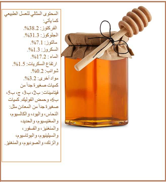 يحتوي العسل الطبيعي على كميات قليلة جداً من المعادن والفيتامينات، وهي كميات صغيرة تكاد لا تُذكر، ويظهر هذا واضحاً في قاعدة بيانات المغذيات العالمية إذ إنّ ملعقة واحدة من العسل الطبيعي تحتوي على: 64 سعراً حرارياً و17.3 غراماً من السكر، ولا تحتوي على الألياف أو الدهون أو البروتينات، كما يحتوي العسل الطبيعي على مضادات أكسدة وآثار مهدئة وقوية ومغذيات نباتية تُكافح مرض السرطان والميكروبات.