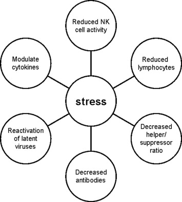 التغيرات الكيميائية في جسم الانسان كأرتفاع الكورتيزول والابنيفرين وغيرها التي تحدث نتيجة الانفعلات العصبية تؤثر بصورة مباشرة على عمل نظام المناعة و أن استجابة الجهاز المناعي تنخفض بنحو 15٪ وتستمر في الانخفاض في المواقف العصيبة المزمنة وأن هرمونات الإجهاد قد تمنع إنتاج السيتوكينات ، وبالتالي تحبط قدرة الجسم على مكافحة العدوى بشكل فعال.