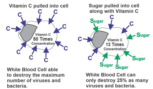لمقاومة العدوى بالبكتيريا او الفايروس فأن خلايا الدم البيضاء تحتاج إلى فيتامين C لامتصاص الفيروسات والبكتيريا وفي الواقع يجب أن تحتوي خلية الدم البيضاء على 50 ضعفًا من تركيز فيتامين سي الموجود عادةً في الدم المحيط به.يتشابه الكلوكوز وفيتامين C في التركيب تقريبا لذا فأن خلية الدم البيضاء تدخل معها الكلوكوز إذا تجاوز تركيز تركيزًا معينًا وعند مستوى السكر في الدم 120 ، تنخفض قدرة خلايا الدم البيضاء على امتصاص وتدمير الفيروسات والبكتيريا بنسبة 50٪. هكذا يقلل تناول السكر مناعة الجسم