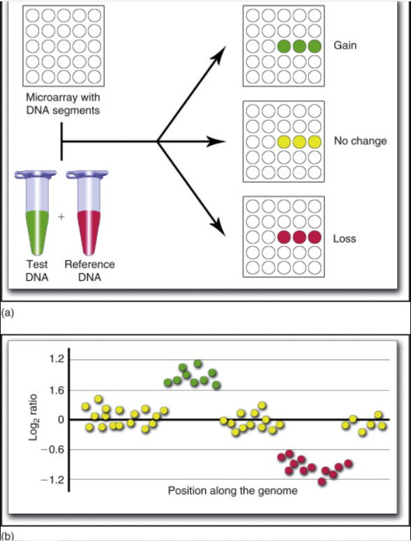 هو تقنية جزيئية تفحص التغيرات في عدد نسخ أجزاء الحمض النووي عبر كامل الجينوم بدون الحاجة لزراعة خلايا حيث يقارن DNA المريض مع DNA طبيعي موسوم بألوان فلورية وتقاس نسبة الألوان للكشف عن حذف أو تضاعف أجزاء من الكروموسومات ما يساعد في تشخيص اضطرابات وراثية مثل التأخر العقلي وتشوهات النمو والإجهاض المتكرر وكذلك في الكشف عن التغيرات الجينية في الأورام السرطانية لتحديد طبيعة المرض وخيارات العلاج.