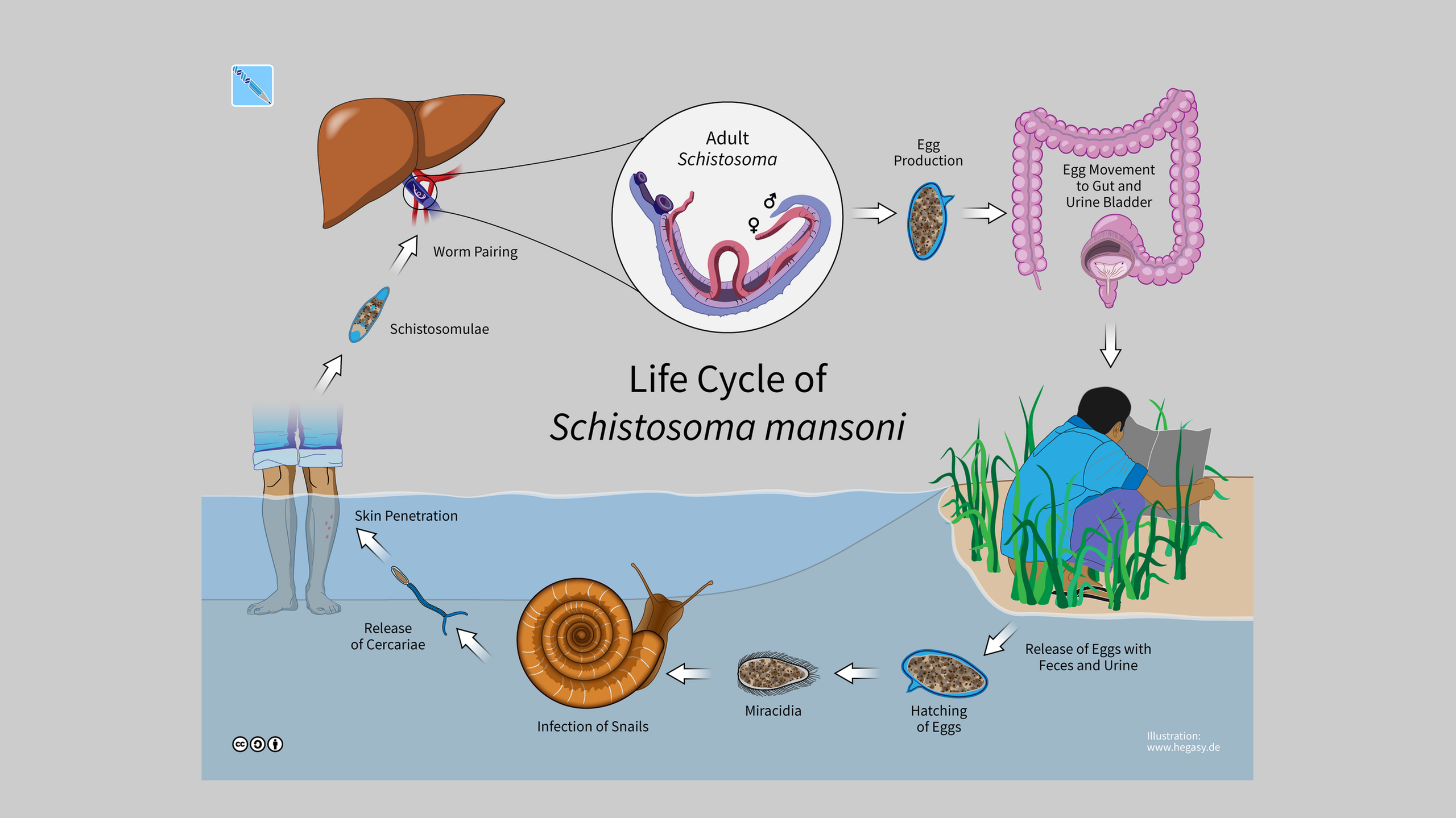 هي عدوى طفيلية مزمنة تسببها ديدان من جنس Schistosoma، وتنتقل للإنسان عند ملامسة الجلد لمياه عذبة ملوثة بيرقات الطفيلي التي تخرج من قواقع مائية. تهاجر الطفيليات داخل الجسم وتستوطن الأوعية الدموية، وتفرز بيوضها التي قد تسبب التهابات مزمنة في الأمعاء أو الجهاز البولي. من أبرز الأعراض دم في البول أو البراز، آلام بطنية، تضخم الكبد أو الطحال، وقد تؤدي لمضاعفات خطيرة كالفشل الكلوي أو سرطان المثانة. يُشخص المرض بفحص البول أو البراز، ويُعالج بدواء (Praziquantel) .