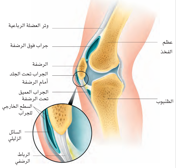 تُظهر الركبة اليسرى في صورة من الجهة اليسرى. إن الجراب الزليلي (Synovial Bursa) هو عبارة عن كيسة مسطحة (flattened sac) تحتوي على السائل الزليلي (Synovial Fluid)، والذي يجعل سطحها الداخلي منزلقًا. هذا الانزلاق يقلل من الاحتكاك ويسمح لـ العضلات (muscles) والأوتار (tendons) بالانزلاق بسهولة الواحدة فوق الأخرى أثناء حركة المفصل (joint movement)، مما يسهم في حركة سلسة وغير مؤلمة للمفصل.