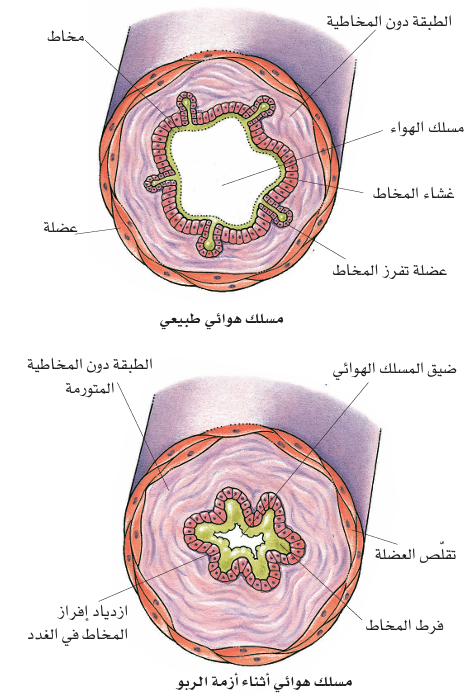 خلال نوبة الربو تتقلص العضلات الملساء الملتفة حول المسالك الهوائية، مما يؤدي إلى تضييق قطرها الداخلي ويزيد من صعوبة مرور الهواء. ويحدث ايضاً إفراز مفرط للمخاط نتيجة للتهيج والالتهاب في البطانة الداخلية للمسالك الهوائية مما يساهم في انسداد هذه المسالك ويزيد من صعوبة التنفس.كما يتسبب الالتهاب في تورم الأنسجة المبطنة للمسالك الهوائية، مما يفاقم من الضيق التنفسي ويقلل من كفاءة نقل الهواء إلى الرئتين. جميع هذه التغيرات تجعل التنفس أكثر صعوبة خلال نوبات…