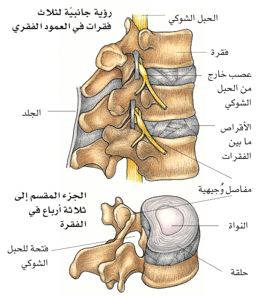 يتم فصل الفقرات (Vertebrae) عن بعضها بمجموعة من الأقراص المرنة بين الفقرات (Intervertebral Discs). ويأخذ كل قرص شكل قطعة من البسكويت المسطحة مع مركز هلامي الشكل يسمى النواة (Nucleus Pulposus) بالإضافة إلى غلاف خارجي ليفي قوي للغاية يسمى الحلقة المحيطة بالقرص (Annulus Fibrosus).