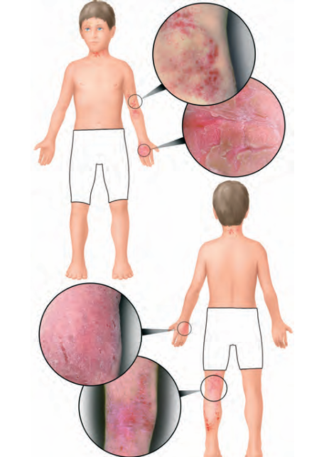 تنقسم الإكزيما إلى عدة أنواع، أكثرها شيوعاً هي الإكزيما التأتبية – وهي النوع السائد لدى الأطفال والأطفال الصغار. وتكون هذه الإكزيما عادة جافة، وتجعل الجلد قاسياً ومحرفشاً وسميكاً أحياناً. وأما في حالات الإكزيما الحادّة، أو بعد فترة طويلة من الحكّ، تتراجع قدرة الجلد على حماية ذاته، فيصبح مبللاً بسائل لا لون له، يختلط بالدم أحيانا وتظهر الدوائر شكل الجلد في المناطق الأكثر عرضة للإصابة.
