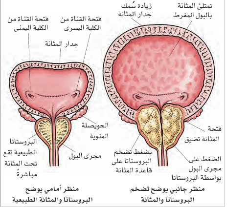 عند حدوث تضخم في غدة البروستات، والتي تقع أسفل المثانة وتحيط بالإحليل ( Urethra)، يبدأ هذا التضخم بالضغط على الإحليل، مما يُعيق تدفق البول (Urinary Flow) ويؤثر سلبًا على وظيفة المثانة . ونتيجة لذلك، تظهر أعراض بولية سفلية تُعرف طبيًا باسم Lower Urinary Tract Symptoms (LUTS)، وتشمل صعوبة في بدء التبول (Hesitancy)، وضعف في جريان البول، والتقطير بعد التبول (Post-void Dribbling)بالإضافة إلى الشعور بعدم إفراغ المثانة بالكامل.