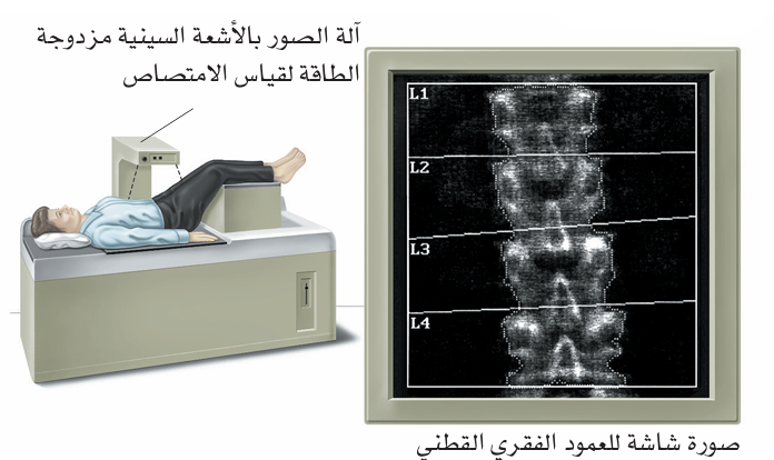 يتم قياس كثافة العظام باستخدام الة التصوير بالاشعة السينية مزدوجة الطاقة لقياس الامتصاص التي توجه حزم من الفوتونات او الاشعة السينية الى العظام وتقيس كمية الطاقة التي تم امتصاصها ، فالعظم الاكثر كثافة يمتص المزيد من الطاقة .