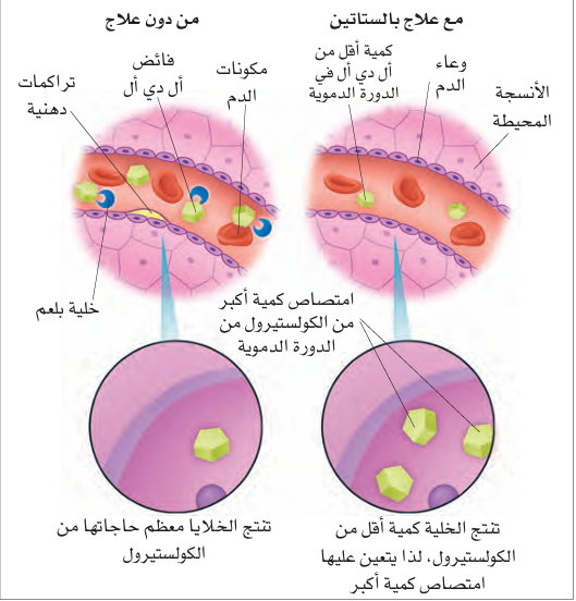 إن عقاقير الستاتين فعّالة جداً في تخفيض مستويات الكوليسترول، وهي تعمل من خلال تخفيض كمية الكوليسترول الذي تنتجه الخلايا داخليا ما يجبر الخلايا على امتصاص كمية أكبر من الكوليسترول من الخارج .