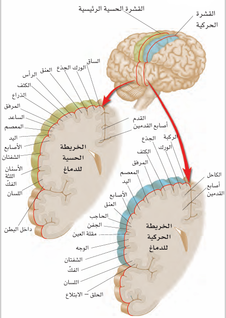 تُظهر الدراسات العصبية أن القشرة المخية تضم تنظيمًا جسديًا دقيقًا يُعرف بـ"خريطة الدماغ"، حيث تحتوي كل من القشرة الحركية الأولية والقشرة الحسية الجسدية الأولية على تمثيل منظّم لمختلف أجزاء الجسم. وتُقسم هذه التمثيلات بين نصفي الدماغ، بحيث تتحكم كل جهة في الإحساس والحركة للجانب المقابل من الجسم.