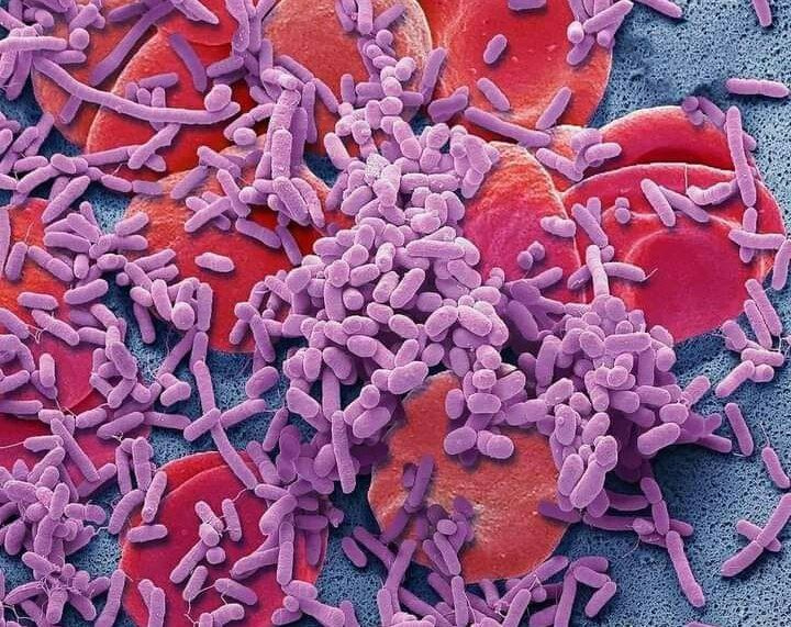 كريات الدم الحمراء محاطة بعدد كبير من البكتيريا في حالة خطيرة تدعى بتجرثم الدم sepsis أو Bacteraemia ، و الاسم الأكثر شيوعا للحالة هو تسمم الدم Blood poisoning ،، الصورة مكبرة بقوة 5000×