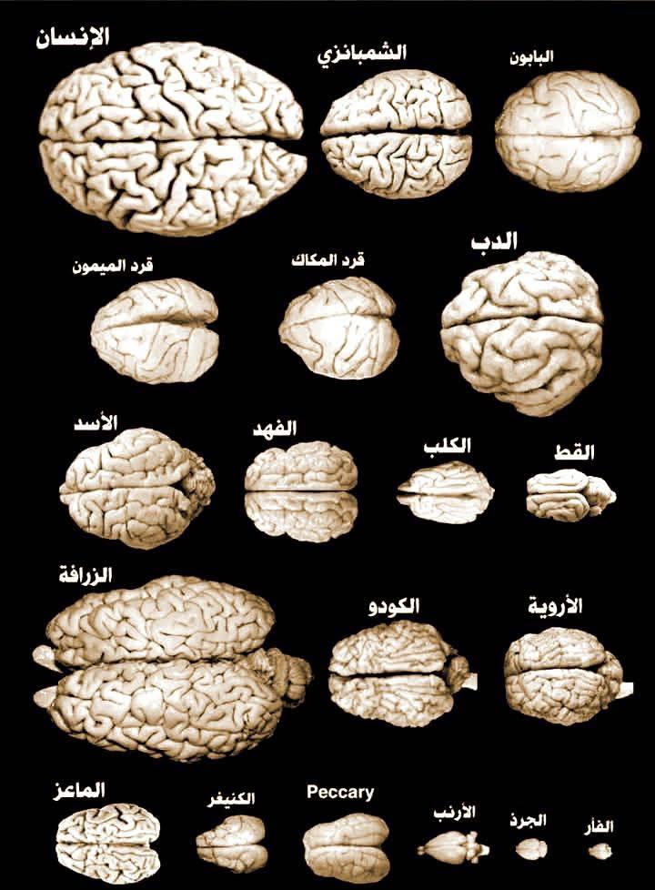 اشكال وأحجام الدماغ لعدد من الكائنات الحية بما فيها الإنسان. يزن المخ فى الإنسان حوالى 1.4 كجم أو ما يعادل 2-2.5% من