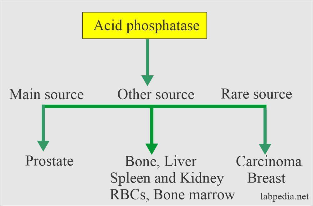 يدل اسم الانزيم على انه يؤدي وظيفته في وسط حمضي ، وهو يوجد بكميات كبيرة في غدة البروستات كما يوجد أيضا في الكرات الحمراء والصفائح الدموية والخلايا الليمفاوية وفي الكبد والطحال والكلى والعظام .