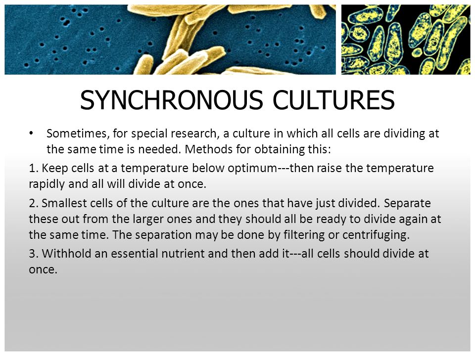 مزارع للميكروبات خاصة الأحياء الوحيدة الخلية مثل البكتريا والخمائر التي تكون معظم الخلايا فيها في الطور نفسه أو متقارب أي تكون في المرحلة نفسها من الانقسام الخلوي ، ويستفاد من هذه المزارع في التقنيات الحيوية للحصول على أفضل الظروف لإنتاج بعض المواد الأيضية والبروتينات الخاصة المحورة لدورة الخلايا في الخمائرCycle – Modulating Proteins.