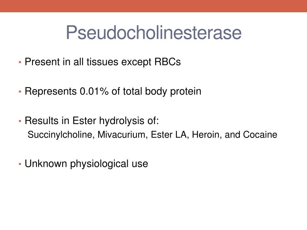 انزيم الكولين استريز الكاذب (Pseudocholinestrase):يعتبر هذا الانزيم غير حقيقي (كاذب) بمناظرته بالانزيم الحقيقي انزيم استيل كولين استريز والذي يوجد في نهايات الخلايا العصبية والمسؤول عن انتهاء الإشارة العصبية ونهاية حركة العضلات بعد أداء وظيفتها .ولكن يوجد انزيم الكولين استريز الكاذب في البلازما والكبد (التي يتكون فيها) والانسجة الأخرى غير العصبية ، وليس لهذا الانزيم تاثير على الاسيتيل كولين الموجود في نهايات الاعصاب ، بينما يقوم بتكسير أي كمية منه تفلت الى الدم .