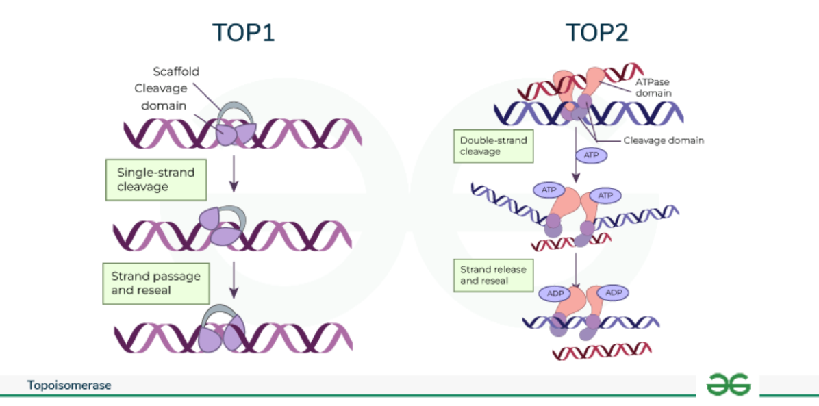 هي بروتينات تنظم البنية الفائقة للحمض النووي (DNA supercoiling) أثناء عمليات النسخ والتضاعف من خلال إحداث كسور مؤقتة في أحد أو كلا شريطي الـDNA ثم إعادة وصلهما، وتنقسم إلى Topoisomerase I الذي يقطع شريطاً واحداً دون حاجة إلى ATP وTopoisomerase II ( DNA gyrase في البكتيريا) الذي يقطع الشريطين ويحتاج إلى طاقة ATP، وتعد هذه الإنزيمات ضرورية لاستقرار الجينوم وهي هدف دوائي لمضادات السرطان مثل etoposide وdoxorubicin ولمضادات حيوية مثل ciprofloxacin التي تثبط DNA gyrase.