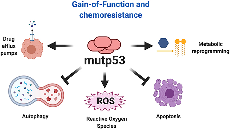 يمثل mutp53 أحد أبرز الأمثلة على طفرات زيادة الوظيفة في الجينات الكابحة للأورام إذ يفقد البروتين الناتج قدرته التنظيمية الطبيعية على تثبيط الانقسام الخلوي وإحداث الموت المبرمج ويكتسب في المقابل خصائص جزيئية جديدة تعزز مقاومة الخلايا السرطانية للعلاج الكيميائي.تسهم هذه الطفرة في إعادة برمجة الأيض الخلوي لتمكين الخلايا من البقاء في بيئات قاسية وتحفز مضخات طرد الدواء التي تقلل تراكم الأدوية داخل الخلية وتزيد من تراكم أنواع الأوكسجين التفاعلية التي تفعل مسارات إشارات تعزز نمو ونجاة الخلايا السرطانية